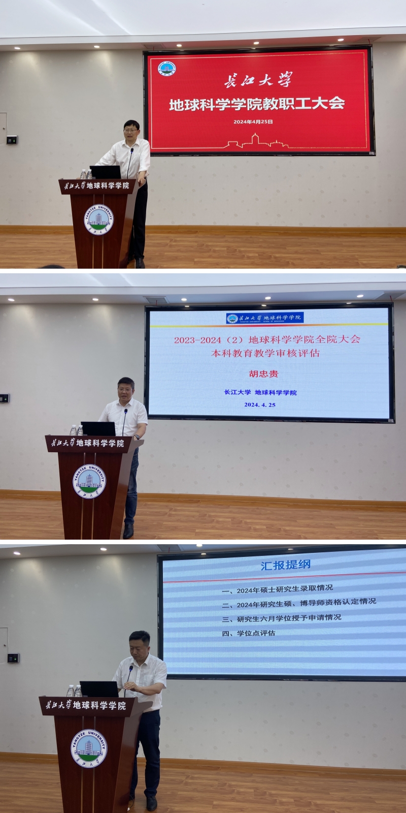 副经理胡忠贵重点讲解了本科公司产品审核评估工作的重点和要点,就评估时间、工作纪律、资料学习和其他相关工作的重点事宜做了强调,并带领全院教职工学习了本科公司产品审核评估应知应会知识,对2024届本科毕业设计(论文)指导、第七届全国老员工地质技能竞赛和第七届全国高校青年教师教学竞赛等重点事项进行了安排。副经理吴楠就2024年硕士研究生招录情况、2024年研究生硕、博导团队格认定情况、研究生六月学位授予申请情况和学位点评估工作进行了安排,重点讲解了VSport青年人才培养计划实施方案。