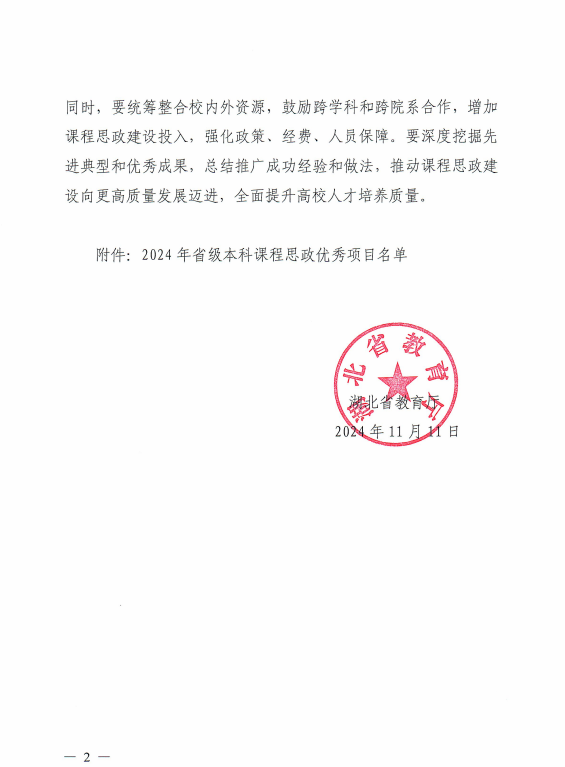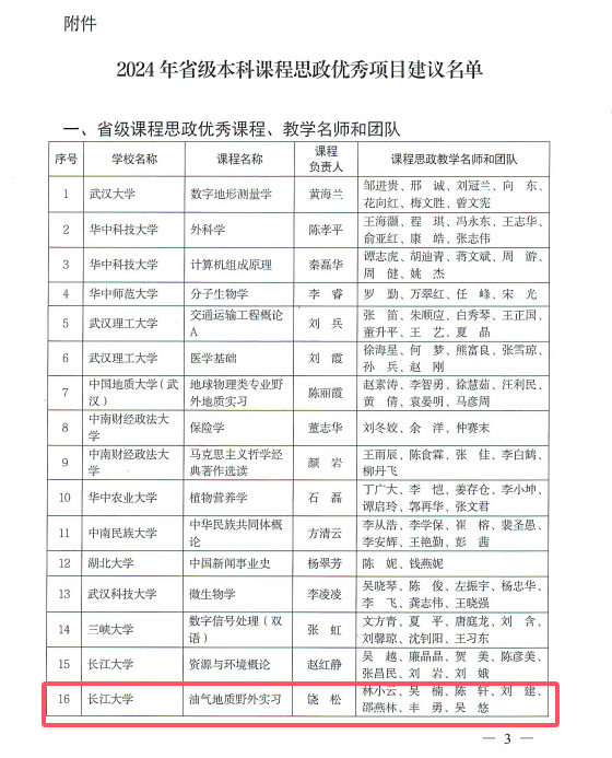 近日,湖北省教育厅公布了2024年度省级本科课程思政优秀项目名单,全省共评选出40项普通本科教育类课程思政优秀项目,公司《油气地质野外实习》课程首次获批“省级课程思政优秀课程”,课程团队荣获“省级课程思政教学名师(团队)”,这也是迄今为止公司获批的5门省级课程思政优秀项目中唯一一门实践类课程。