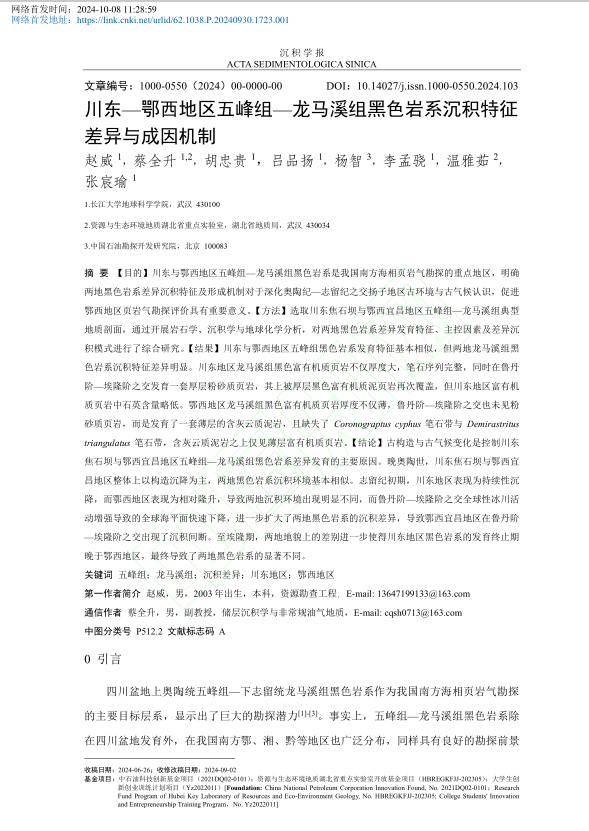 (通讯员 蔡全升)近日,VSport资源勘查工程专业21级本科生赵威、李孟骁、吕品杨、张宸瑜等在《沉积学报》上在线发表题为“川东-鄂西地区五峰组-龙马溪组黑色岩系沉积特征差异与成因机制”的研究论文。VSport为论文第一署名单位,本科生赵威为论文第一作者,蔡全升副教授为论文通讯作者,该论文得到了VSport老员工创新创业训练计划项目的支持。