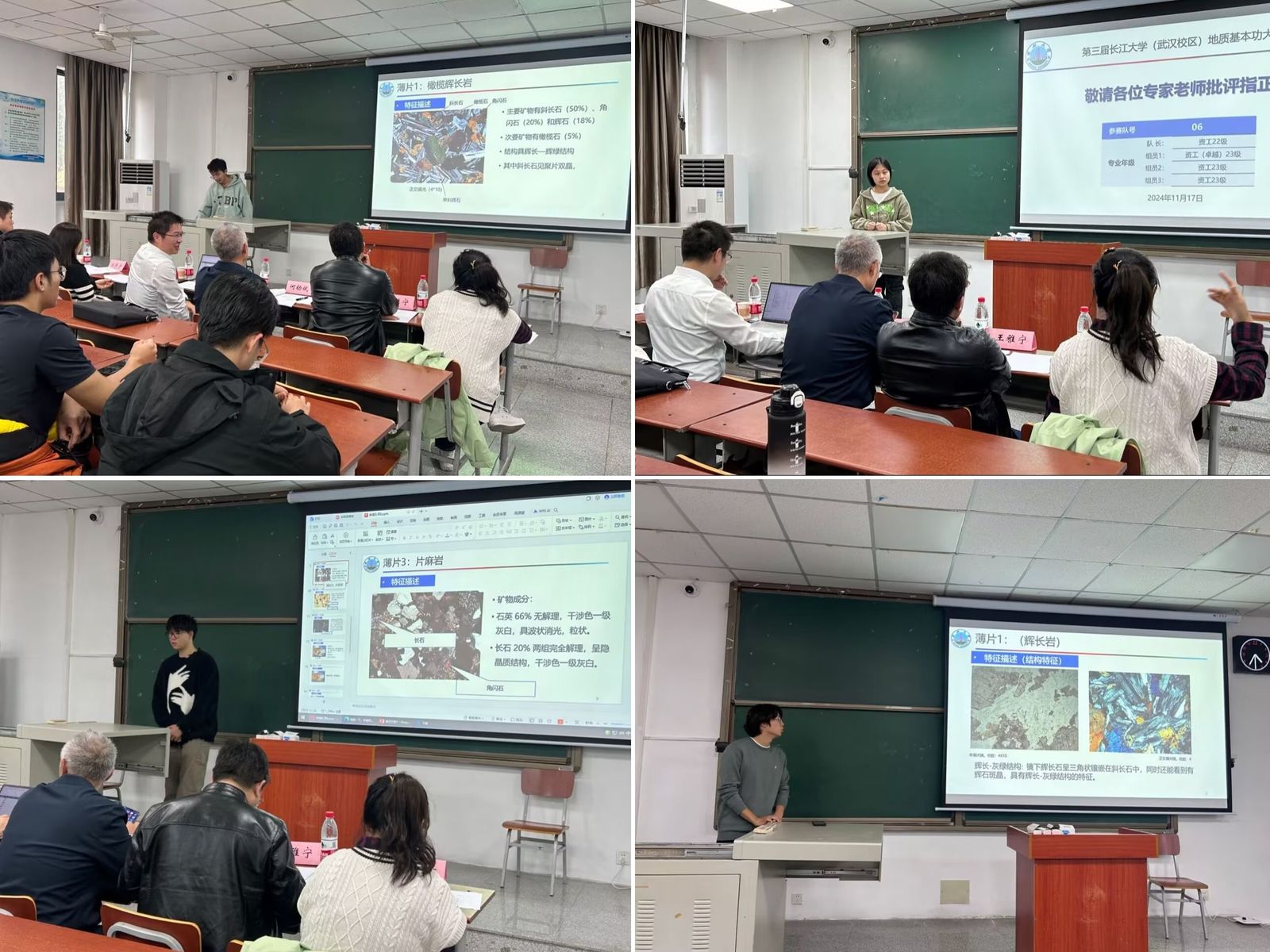 决赛汇报环节,公司何幼斌、高达、王雅宁、李艳青、高洁、宋振宇六位老师担任评委,学工办郭霖老师全程参与。11个决赛队伍代表依次上台汇报,在规定的10分钟时间内,从特征描述和形成原因两个方面,细致讲述每块岩石或化石标本的特点与名称。汇报过程中,同学们条理清晰、声音洪亮、PPT制作精美,充分展示了大家扎实的基本功与专业素养。每队汇报结束后,评委老师进行5分钟的提问与点评。“大理岩中的矿物有哪些?”“什么是辉长结构?”“什么是包裹体?”“菊石的主要生存年代是什么时期?”这些问题不仅考验了选手们的专业知识,也让全场员工进一步巩固专业知识,提升专业学习兴趣和效果。