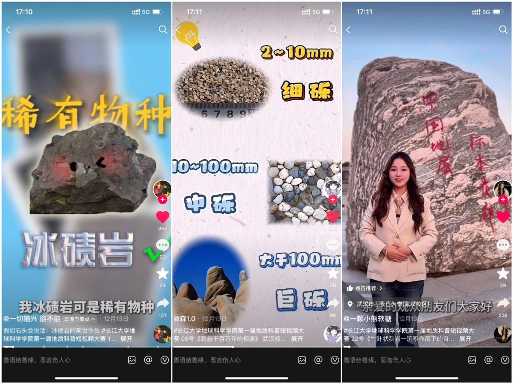 大赛要求参赛作品以中国地层标本长廊(武汉校区)和长江三峡地层标本长廊(荆州东校区)中的一块岩石为载体,围绕该岩石及其所在地层的地质现象、形成过程、古环境、古生物特征及古构造演变等一个或多个方面进行科普创作。此次比赛吸引了来自东校区与武汉校区超过百名员工的热情参与,共提交了27部高质量的原创地质科普短视频作品。在专业教师的指导下,各参赛队伍从冰碛岩的历史变迁到竹叶状灰岩的成因探索;从沉积作用到火山活动的影响;再到海陆变迁以及地质灾害等多个角度出发,制作出了既通俗易懂又富有创意且形式多样的短视频内容。评审环节分为专家评审打分及公众评审两部分。其中,由高达老师与郭霖老师联合邀请跨学科领域的多位教师组成评委会,依据科学性、普及性和艺术表现力等因素对每部作品进行全面评估。而大众评审则基于抖音平台上视频点赞数、转发量及网络投票结果来决定。截至发稿时止,所有参赛视频在抖音上的总播放量已超过9万次,并获得超过6000个赞。
