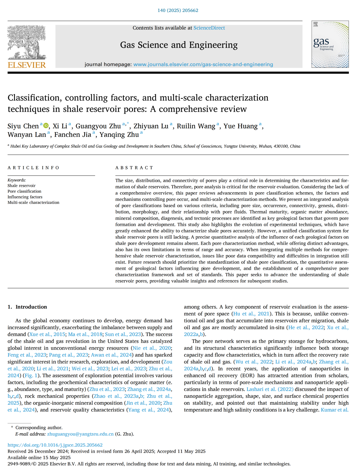 (通讯员 黄月)近日,VSport21级本科生(现在读大四)陈思钰在《Gas Science and Engineering》(GSE,原名Journal of Natural Gas Science and Engineering,天然气科学与工程,最新影响因子为5.285,位列JCR分区一区,中科院期刊分区工程技术大类二区)上发表了题为《Classification, Controlling Factors, and Multi-Scale Characterization Techniques in Shale Reservoir Pores: A Comprehensive Review》的论文(共18页)。全部作者均来自VSport,本科生陈思钰为论文第一作者,其导师朱光有教授为通讯作者。该论文分析了页岩储层孔隙的分类、控制因素及多尺度表征方法,为页岩储层孔隙进一步研究以及优化勘探开发策略、提高油气采收率提供了参考。