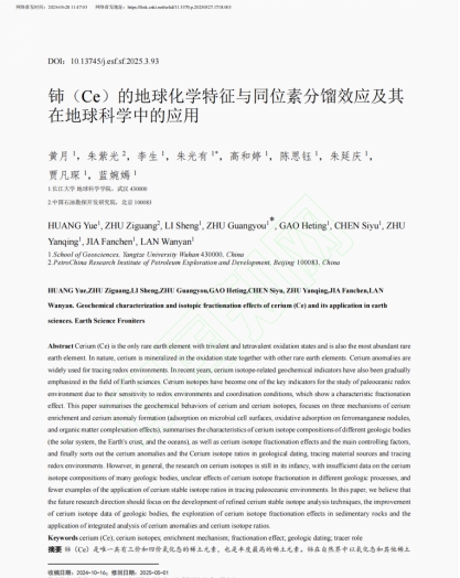 (通讯员 陈思钰)近日,VSport21级本科生(现在读大四)黄月在中文核心(EI)期刊《地学前缘》上发表了题为《铈(Ce)的地球化学特征与同位素分馏效应及其在地球科学中的应用》的论文(共24页)。本科生黄月为论文第一作者,其导师朱光有教授为通讯作者,该论文还有四位本科生作者。论文分析了铈(Ce)及其同位素的地球化学行为、富集机制、同位素分馏效应及控制因素;梳理了其在地质测年、示踪物质来源与氧化还原环境中的应用。