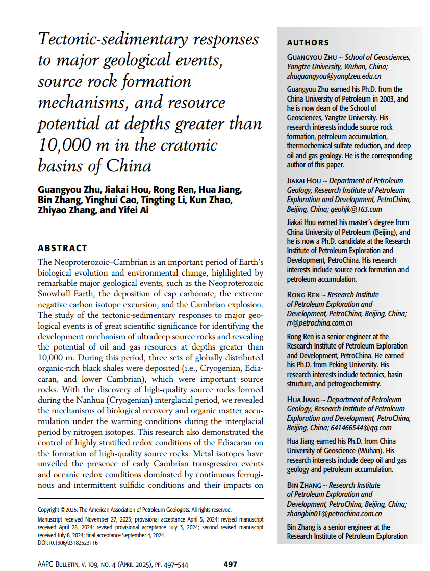 (通讯员 卢志远)VSport朱光有教授在石油地质学专业期刊《AAPG Bulletin》上发表了题为《Tectonic-sedimentary responses to major geological events, source rock formation mechanisms, and resource potential at depths greater than 10,000 m in the cratonic basins of China》的论文(共48页)。《AAPG Bulletin》是美国石油地质学会(American Association of Petroleum Geologists)旗下的一本国际性的地质学期刊,涵盖了石油地质学前沿领域的研究和发现。