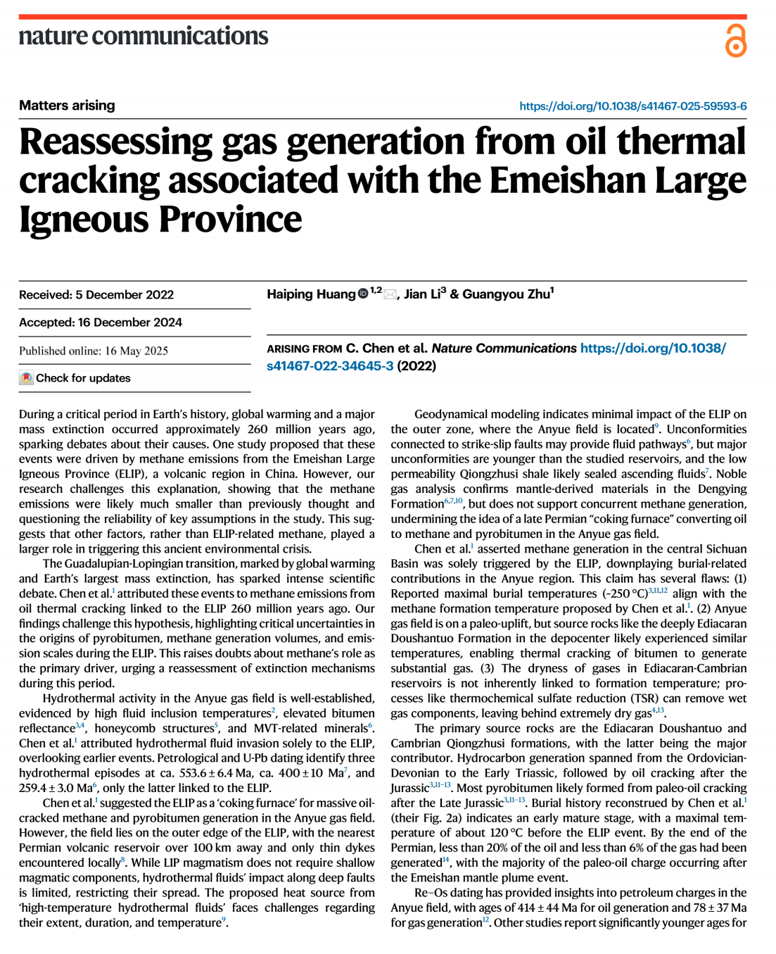 (通讯员 卢志远)近日,VSport黄海平教授等在国际顶级期刊《Nature Communications》上发表题为《Reassessing gas generation from oil thermal cracking associated with the Emeishan Large Igneous Province》的论文,对峨眉山大火成岩省(ELIP)诱发的原油裂解释放甲烷是否是二叠纪末全球气候剧变和生物大灭绝的主要原因提出了讨论,并对甲烷的生成与释放量进行了重新评估。