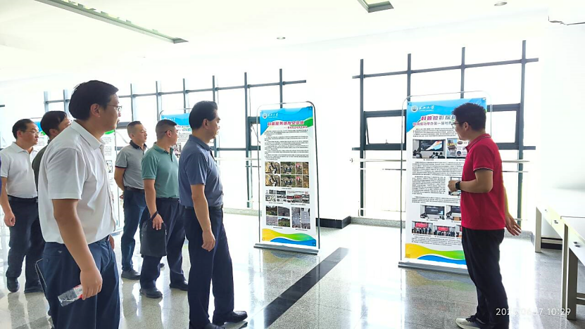 朱志斌一行先后考察了中国地层标本长廊、沉积模拟实验室、古生物化石及矿物岩石陈列室。科普基地李涛、罗进雄、高达、高洁、辛长静等教师分别就中国地层标本长廊、沉积模拟实验室、标本陈列室的建设背景、建设历程、取得的成果和开展的科普活动向朱志斌主席一行做了详细介绍。