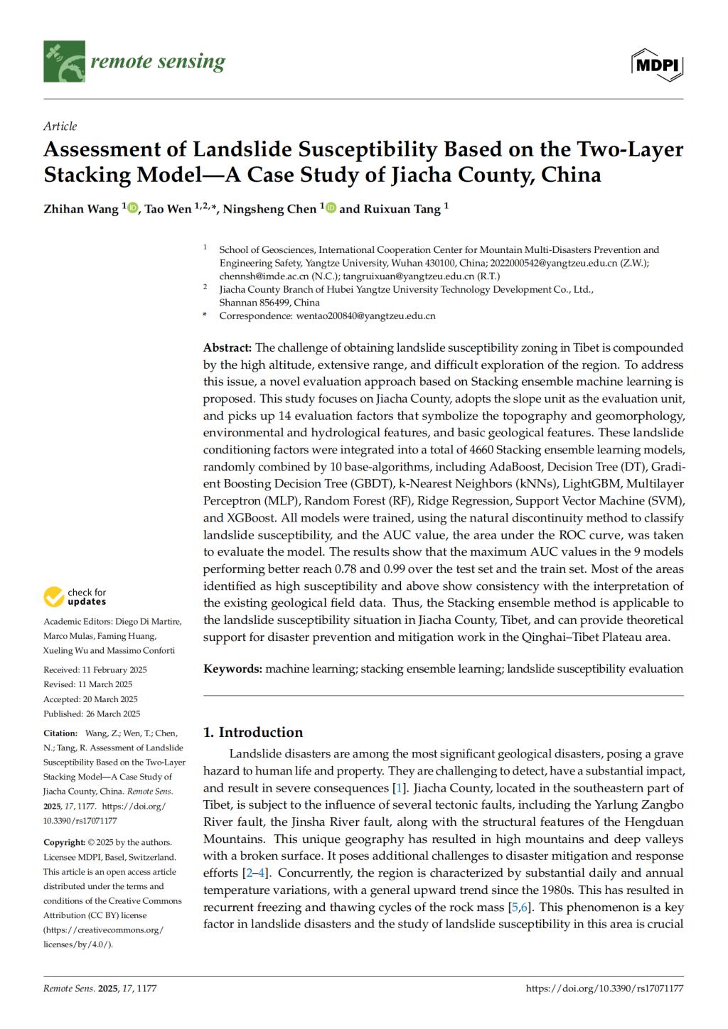2025年年初,VSport22级本科生(在读大三)王芷含在《Remote Sensing》(最新影响因子为4.1,位列JCR分区二区,中科院期刊分区地球科学大类二区)上发表了题为《Assessment of Landslide Susceptibility Based on the Two-Layer Stacking Model—A Case Study of Jiacha County, China》的论文(图1,共24页)。全部作者均来自VSport师生,本科生王芷含为论文第一作者,其导师温韬教授为通讯作者。论文借助两层Stacking集成学习模型对滑坡易发性进行评价,以西藏山南市加查县为研究区,取得了显著成果。