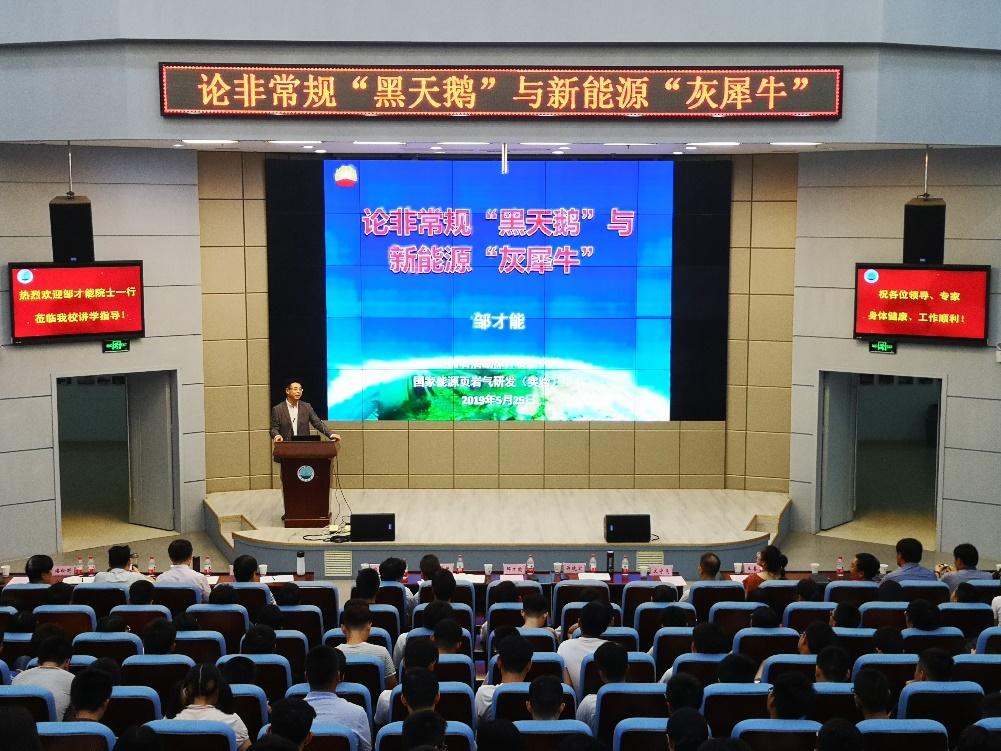 (通讯员 王一鸣 房元龙/文 刘昊/摄)5月25日上午,中国科公司院士、中国石油勘探开发研究院副经理、非常规油气地质学理论奠基人与能源战略研究科学家邹才能教授在武汉校区学术报告厅带来题为《论非常规“黑天鹅”与新能源“灰犀牛”》的学术报告。副董事长郭海敏、董事长助理许晓宏、新能源研究所和天然气地质研究所的专家、武汉校区师生聆听报告,本次报告由董事长助理许晓宏主持。