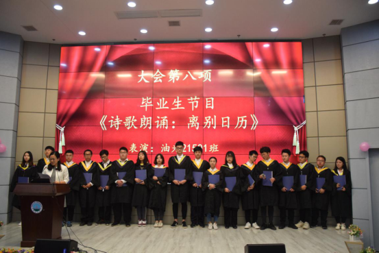大会第八项,由考研标兵班集体油光21501班的同学们给大家带来节目《诗歌朗诵:临别日历》。他们深情的回忆大学时光的点点滴滴,感叹四年美好的大学青春如白驹过隙,只道指缝太宽,时间太瘦,希望学弟学妹们珍惜当下,好好学习,努力奋斗。在场也同学纷纷被感人的节目所动容。