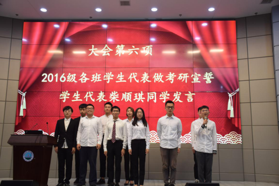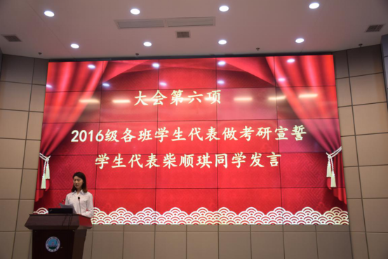 大会第六项,2016级各班员工代表做考研宣誓,将会场的气氛带到高潮,各班同学代表逐一宣誓、为班上同学加油打气,台下同学纷纷激动鼓掌。随后,由2016级员工代表柴顺琪发言,她鼓励大家道:“考研是一场自己的战斗,我们和其他考生都在同一起跑线上,我们不要妄自菲薄,更不要轻言放弃。我们要珍惜一切时间和机会为考研奋斗,做考研路上的斗士。”