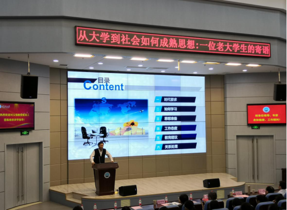 本次讲座的主题为“从大学到社会如何成熟思想”,刘玉强教授以一位老老员工的视角,分别从时代要求、学习方法、思想准备、工作态度、教育建议及事业与生活六个层面为到会师生开展了一场形式活泼、内容深刻的主题教育活动。