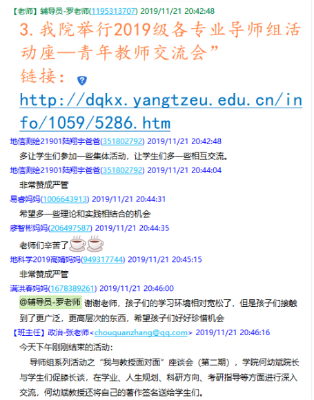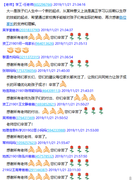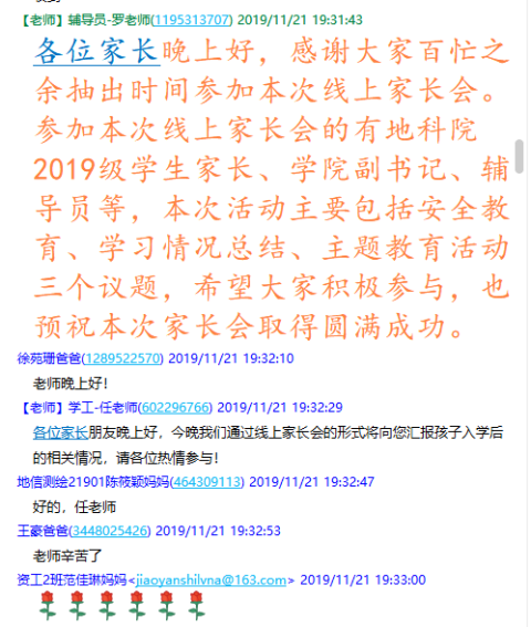 (通讯员罗小玉)11月21日晚19:30,公司在2019级员工家长群召开了19级本科生第一次线上家长会,此次家长会由年级辅导员罗小玉主持,公司党委副书记任倩、辅导员王宁、潘志远、张严、辅导员助理周寒及255名员工家长共同参与了本次线上讨论。