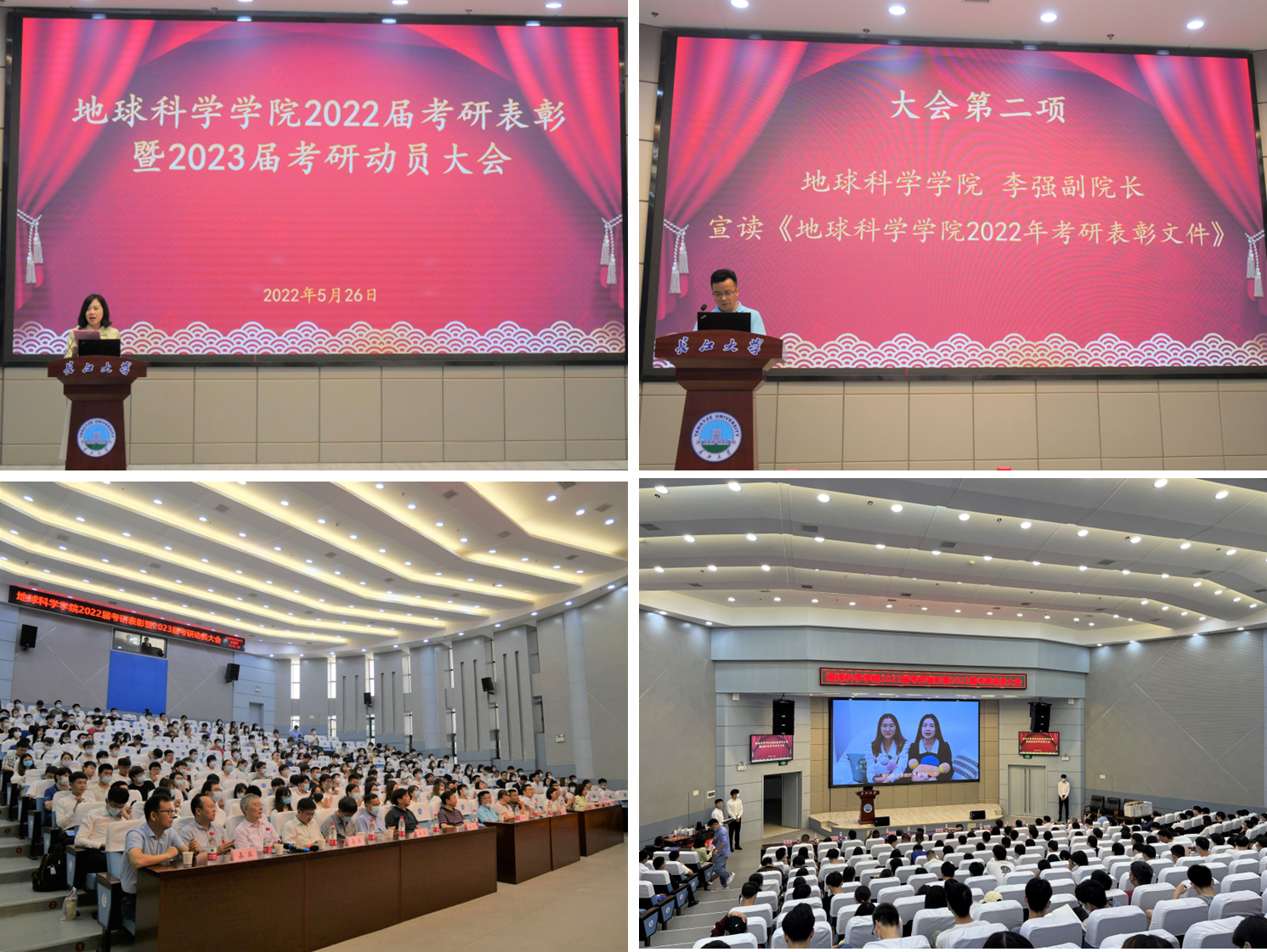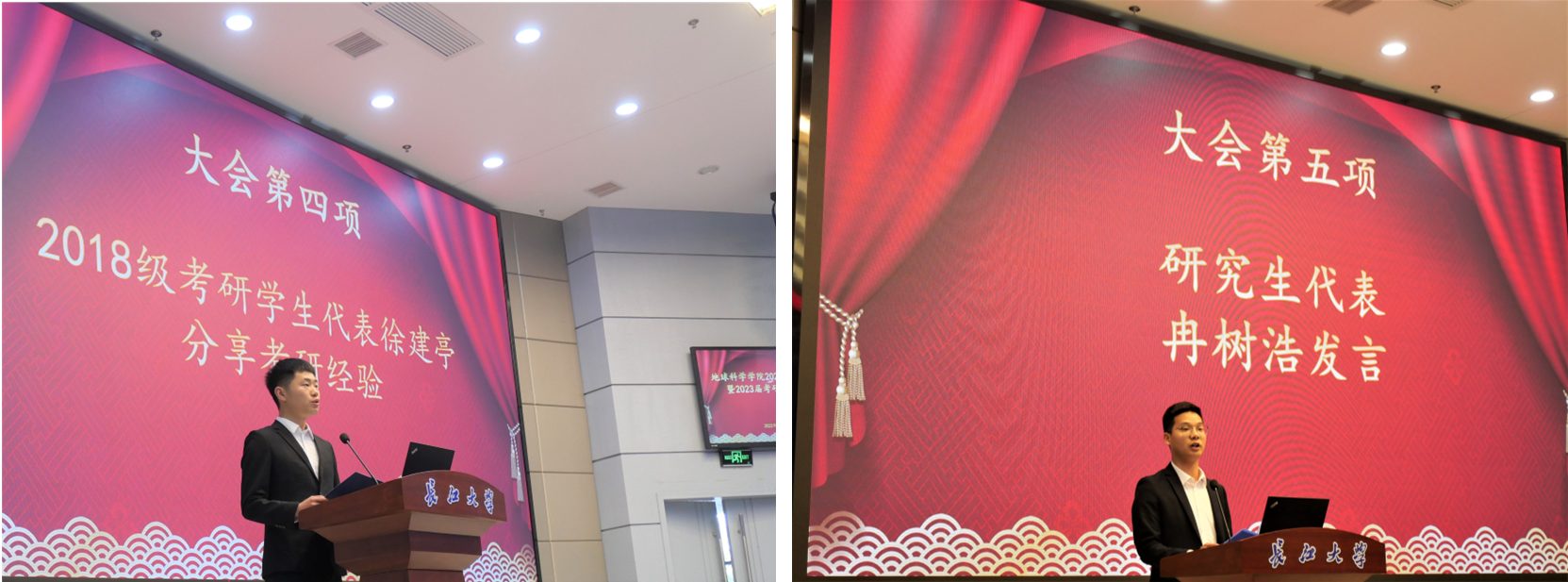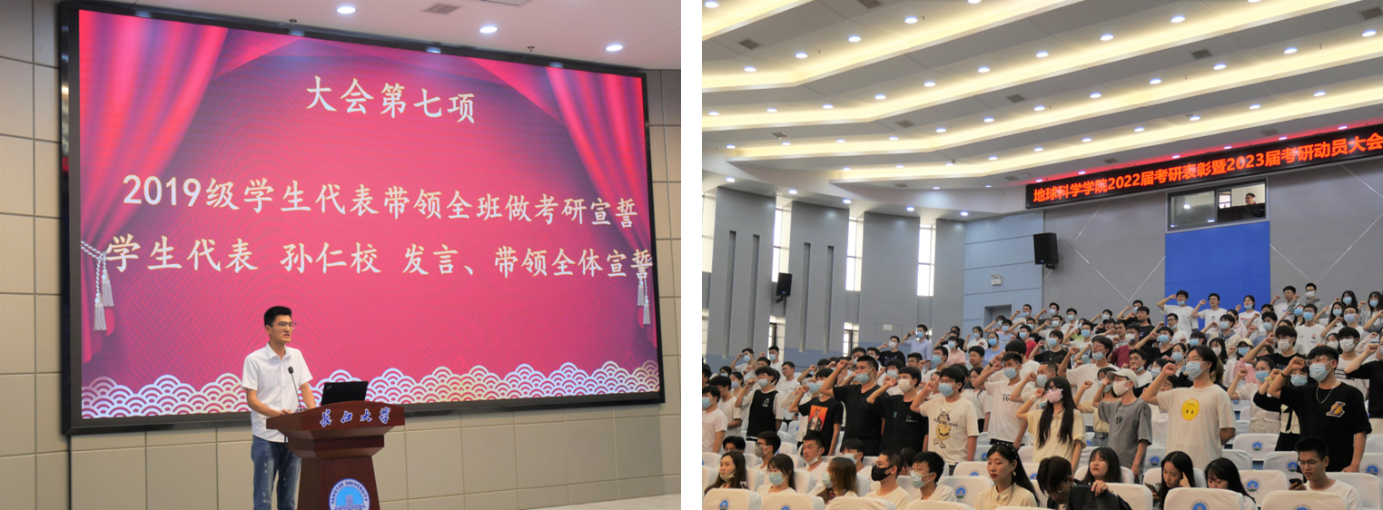 接着,2022届考研员工代表徐建亭和研究生代表冉树浩先后上台分享考研经验和学习经验。去年今日,徐建亭作为员工代表在此带领全体18级同学进行考研宣誓,如今他如愿以偿被中国地质大学(武汉)录取,他说:“漫漫考研路,初心很重要,我们要明白自己考研的目标。”冉树浩回顾了自己在长大度过的七年时光,勉励学弟学妹们:“坚定理想信念,培育高尚品格,练就过硬本领,勇于创新创造,矢志艰苦奋斗,在实现中华民族的伟大复兴的进程中书写自己的青春赞歌!”临近毕业,他们也表达了对母校、老师和同学的感恩和不舍。