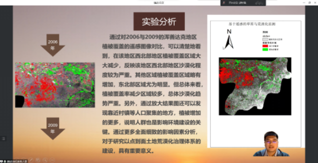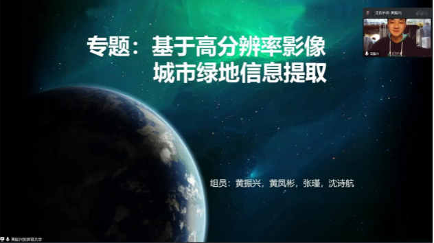 第一个答辩环节,选手们根据自己的选题和研究内容分别从选题背景与目的、数据与技术路线、数据处理流程、过程总结等四个方面进行介绍。重点讲解了如何运用遥感处理软件并结合当前环境保护形势,来处理和分析已有的数据,最终得出结论。其中,刘亚唯组以《基于像元二分模型的植被覆盖度反演》为选题,重点介绍了“像元二分模型”在数据处理过程中发挥的重要作用。