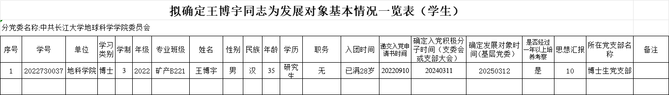 附:拟确定王博宇名同志为发展对象基本情况一览表