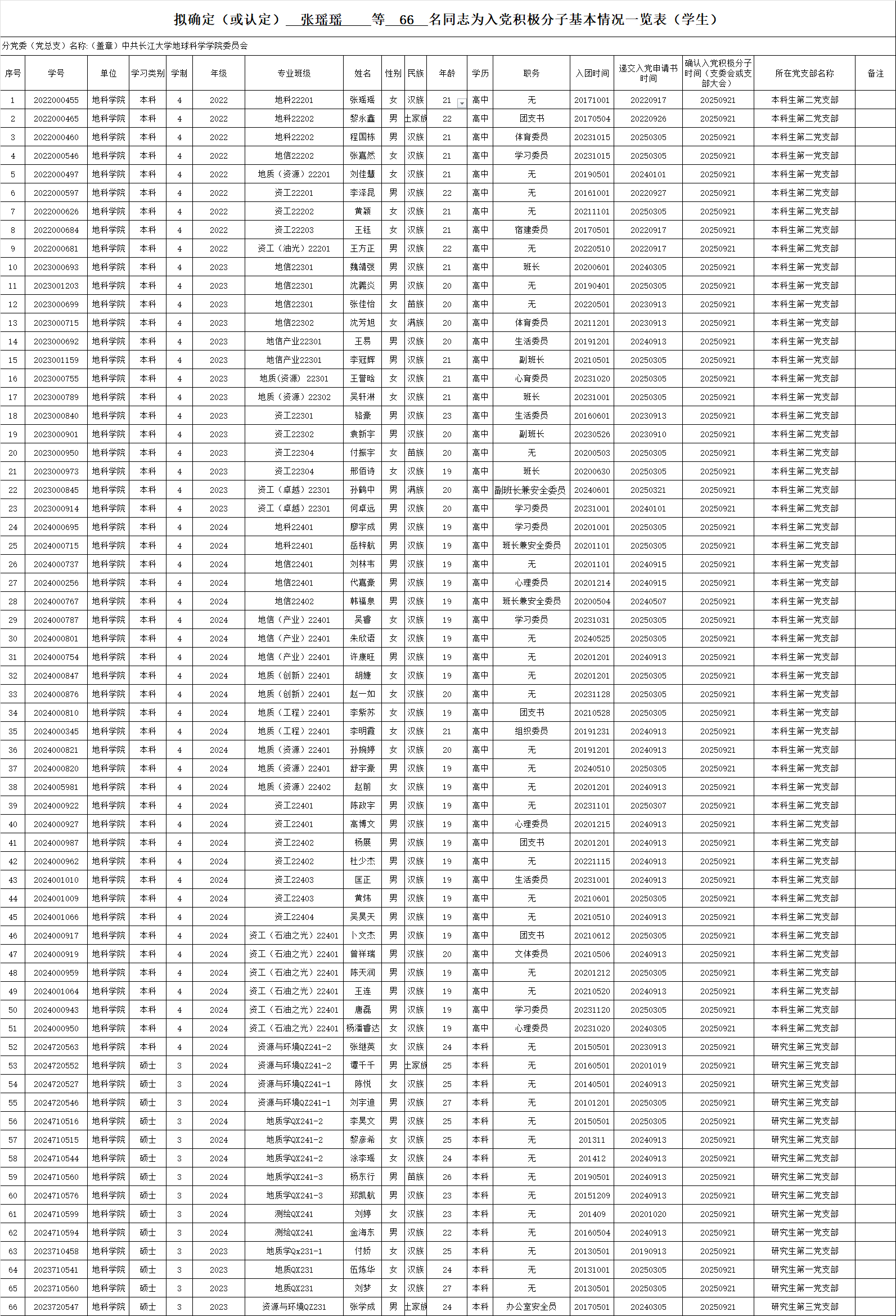 附:拟确定张瑶瑶等66名同志为入党积极分子基本情况一览表