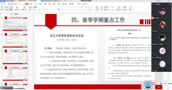 主题班会从返校时间安排、返校步骤、新冠病毒感染疫情防控操作指南学习、春季学期重点工作四个方面展开。首先,辅导员老师为同学们讲解了返校及开学的时间安排,并向大家强调不能擅自提前返校。接下来,辅导员老师对返校的6步骤逐一进行了讲解,特别是对“打卡”和“申报”环节,要求返校员工必须保证连续7天健康打卡,延迟返校员工需严格办理延迟返校手续。随后,组织全体员工集中学习了《新冠病毒感染疫情防控操作指南》,要求科学做好检测,确保疫苗“应接尽接”,倡导做好个人防护。最后将期末考试、英语四六级考试、毕业生就业及考研复试工作进行了强调与动员,特别强调了考风考纪,要求参考员工严格遵守考试纪律。