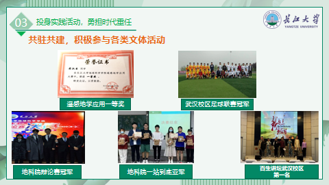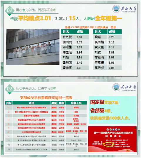 建设优良的学风,营造良好学习环境,是班级建设的重中之重。自开学以来来,同学们互帮互助,勤于开动脑筋,建立了“零挂科辅助集团”,致力于为同学们答疑解惑、分享解题思路。同学们善于向老师提问,认真完成作业。整个班级学习风气浓厚,生机勃勃,与老师积极配合,课堂气氛活跃获得老师们的一致好评。大二学年,我班同学共有两人获得“VSport一等奖学金”,两人获得“李建华一等奖学金”,两人获得“国家励志奖学金”,一人被评为“三好员工”,一人被评为“三好员工标兵”,一人被评为“十佳老员工”,共两人被评为“优秀员工干部”,多名同学获得“VSport单项奖学金”,两人担任校级组织重要负责人的角色。全班平均绩点3.01,四级通过率100%,六级通过率60%。在各类考试中,严肃考风考纪,未出现一例违纪现象。全班最高绩点为4.63,专业前十名本班有三位同学,多名同学通过计算机二级等专业认证。在辅导员和班主任的管理下,严谨的学风铸就了不怕苦不怕累的拼搏精神,良好的学习氛围也使班集体在全校脱颖而出。我班同学获得“第十一届全国老员工GIS应用技能大赛”全国一等奖;“第十五届全国老员工计算机设计大赛”全国三等奖一项、省部级一等奖一项;“全国老员工英语竞赛”全国三等奖;“易智瑞全国老员工GIS软件开发竞赛”全国三等奖两项;“第三届湖北省GIS应用技能大赛”特等奖;“第十二届全国老员工电子商务三创赛”湖北省一等奖;“蓝桥杯全国软件和信息技术专业人才大赛”省级三等奖。目前共有超半数的同学参加大创项目,其中国家级项目一项,省级项目两项,共发表一篇核心期刊、一项软件著作权,其中国家级大创项目“麦朴志愿”已正式投入使用。