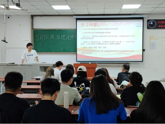 (通讯员 王少宁)为督促公司研究生深入学习贯彻习近平新时代中国特色社会主义思想,深入学习“四史”教育的价值导向,提升公司研究生政治理论素养,在思想上、政治上、行动上时刻同党中央保持高度一致。于5月31日正午,公司研究生在武教A108教室集中进行了线下政治理论学习活动,此次政治理学习活动由研究生会主席刘作松主持与讲解,部分研究生参加。