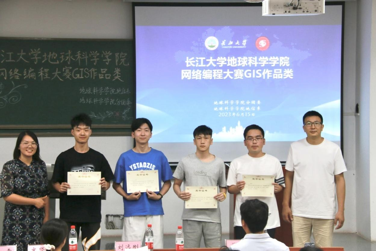 最终,“地图制图组”中,“起名好难队”获一等奖、“从容面队”获二等奖、“火种传播队”及“知执咫制图不滞图”获三等奖;“程序设计组”中,“GISBOYS”获一等奖、“星梦小组”获二等奖、“岩性识别组”及“盾构隧道组”获三等奖。评委老师分别为获奖队伍颁奖并合影留念。
