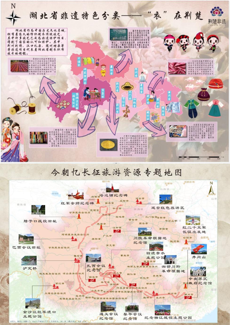 “地图制图组”由各参赛队伍派代表上台答辩。大家一边阐述设计思路、制作过程、绘图工具等内容,一边向大家展示本队绘制的精美地图集,赢得观众阵阵掌声。“火种传播队”的作品设计新颖,逻辑清晰,多角度、全方位展现了红军长征的壮阔图景。“从容面队”以荆州非遗文化为主题,从“衣、食、住、行”四个方面用地图的形式展示了荆州非遗文化的代表元素、发展进程、保护与传承。高贤君老师对同学们的作品给予了高度评价,希望同学们将专业知识与社会发展、文化传承、服务社会相结合,做有学识、负责任、有担当的地科学子。