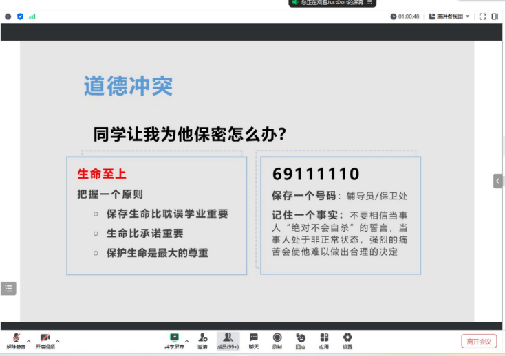 (通讯员 张梦琪)公司于2023年6月30日通过腾讯会议的方式举行以“危机干预与自杀预防”为主题的心理讲座。各年级班长、团支书、安全员、心理委员、寝室长及暑期留校员工等共计499名师生参与学习交流,心理专干王红桥老师主讲。