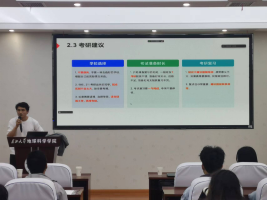 吕梦楼以一名地科学长的身份给大家分享了自己的工作经验、考研感悟、老员工活。他认为地信专业就业面很广,薪资待遇也很不错,但是需要学弟学妹们扎实掌握软件开发相关的基本知识、编程语言、基本技能,才能有机会通过HR的考核。他以自己的二战经历建议同学们,在公司选择上要结合自身实际,选择最合适而非最好的公司,建议复习过程一气呵成,不要把战线拉得太长,导致强弩之末、后劲不足。在分享自己的老员工活时,他鼓励同学们要做好时间的主人,明确目标,细化学习计划,长期保持持续学习的热情,深耕更多课堂之外的技术知识,并尝试参与一些学科竞赛、科研项目和社会实践活动,开拓自己的眼界。