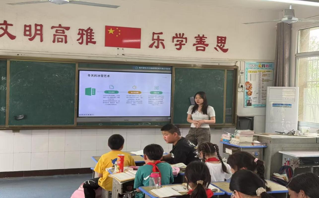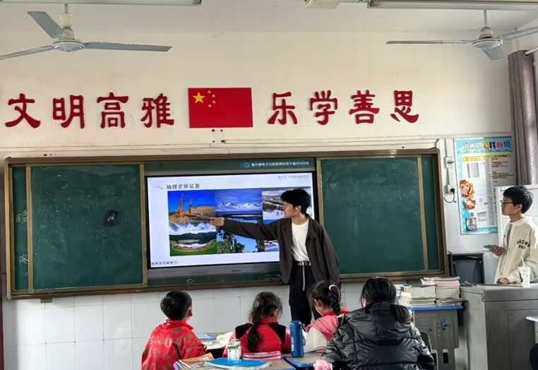 在“神奇地球”小课堂上,志愿者用生动形象的比喻讲解地球构造,把地壳比作“鸡蛋壳”,地幔比作“蛋白”,地核则是"蛋黄",让孩子们轻松理解抽象概念。在讲解中国气候时,志愿者用"庄稼地里的不同菜畦"来打比方——沿海地区就像"水稻田",总是湿漉漉的;西北地区好比"旱地瓜田",干得裂口子;青藏高原则像"冬天的大白菜地",常年盖着雪被子。在讲解中国河流时,志愿者化身"河流爷爷",给孩子们讲起了"水的旅行故事":"从前啊,长江哥哥和黄河弟弟从青藏高原的'冰雪城堡'出发。长江哥哥性子急,一路蹦蹦跳跳穿过峡谷;黄河弟弟走得慢,边走边玩泥沙,结果把自己都染黄啦!" 这种寓教于乐的授课方式,让深奥的知识变得触手可及,不仅激发了孩子们的好奇心,更让教室变成了欢乐的乐园。