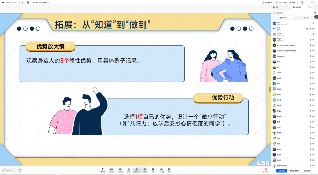 王红桥老师从生理自我、心理自我、社会自我三个维度展开对自我认知的讲解,并分享增强自我认同的两个自我探索的方法:“20个我是谁”、“每日优点记录”,她还介绍了“优势卡牌”,引导同学们通过与他人的互动发现潜在优势。结合老员工心理困惑案例,王老师带领同学们剖析自我认知偏差的成因与表现,深化了大家对自我认知的理解。对于如何悦纳自己的缺点与不足,王老师用具体生活事例说明不同特质在学习、生活和职业发展中的作用,并分享“优势探索表”,指导大家转换对缺点的看法和评价,提升心理健康水平。