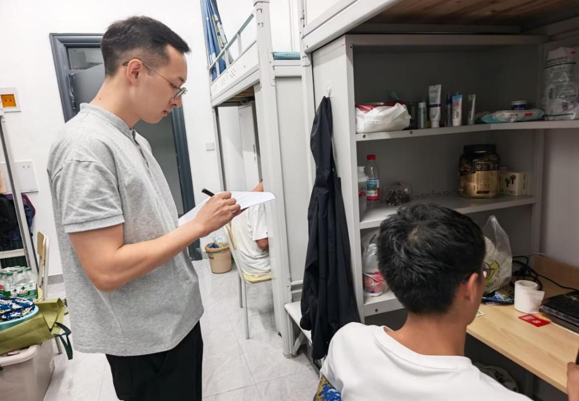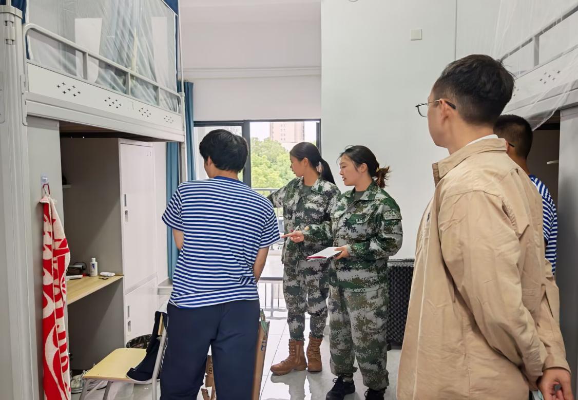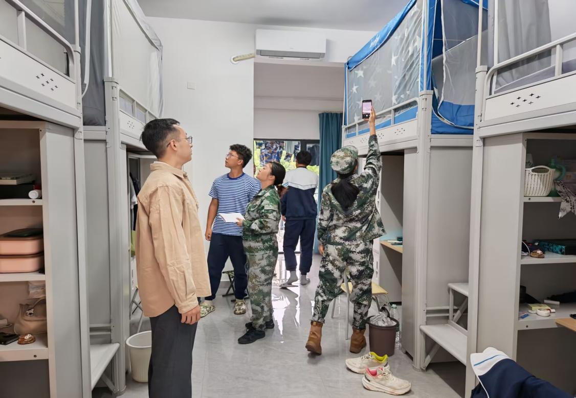 9月16日至18日,辅导员黄瑱、教官及兼职辅导员深入新生宿舍,对宿舍内务进行考评。教官们围绕床铺整理、物品摆放、公区卫生等环节对新生耐心指导、逐一查验并量化打分。黄老师检查住宿设施安全,关切询问军训适应情况,并就校园生活常见问题予以解答,叮嘱员工注意军训防护、及时反馈需求,鼓励员工互帮互助,营造温暖融洽的集体氛围。