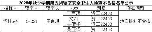 为加强员工宿舍安全管理和文明建设工作,确保员工宿舍安全、整洁、文明、有序,根据公司要求,公司于10月9日开展了第5周员工宿舍自查工作,现将检查情况通报如下