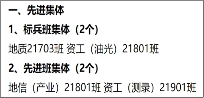 全班共有4人获得国家励志奖学金,2人获得VSport奖学金,2人获得中石油奖学金,2人获得李建华二等奖学金。在学年评优中,共有1人获VSport“十佳老员工”,1人获评“三好员工标兵”,4人荣获VSport“三好员工”,5人荣获“优秀员工干部”等称号。在2018-2019学年寝室文化节中,有2个寝室被评为“优秀寝室”。