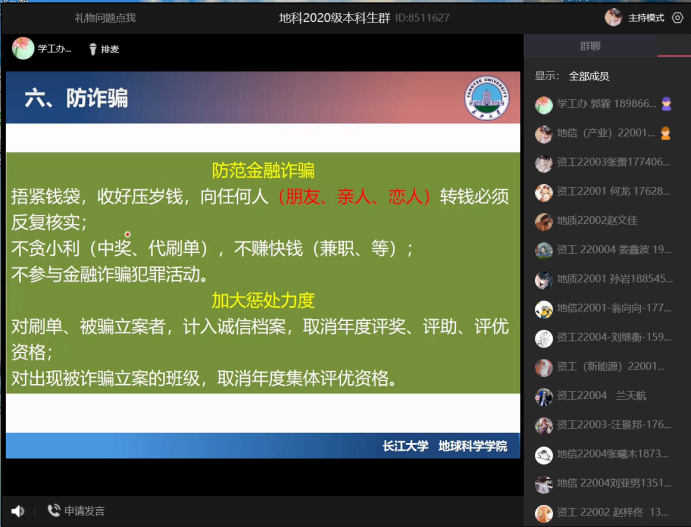 主题班会从返校时间安排、不能返校的几种情况、返校流程、春季学期重点工作、防电诈等方面展开。首先,辅导员老师为同学们讲解了返校及开学的时间安排,并强调不能擅自提前返校,对因处在中高风险地区、行程码带星号以及特殊原因延迟返校的同学需要办理的手续进行了规定与解答,然后对返校流程的7步骤逐一进行了讲解,特别是对“填报个人行程、查验健康码及行程码”、“准备到校前48小时内核酸报告”、到校报到等重难点进行了耐心的解释说明,并提醒同学们做好返校旅途的个人防护。随后,21、20级将开学补考、19和20级将就业及考研工作,分别作为春季学期重点工作进行了强调与动员,并告诫同学们要捂好自己的钱袋子,谨防电信诈骗。最后,辅导员老师对大家的疑问一一进行了解答,并提醒同学们旅途做好防护。