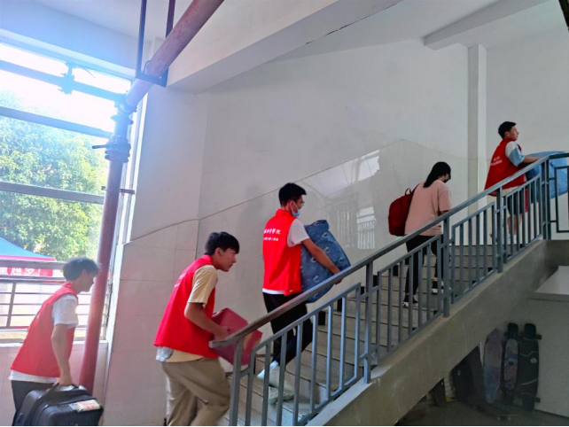 通过前期安排,新生到达公司迎新点后,按报到流程,进行行李消杀、身份核查、领取通行证及校园卡、登记信息、然后在志愿者的协助下搬运行李,到宿舍办理入住。