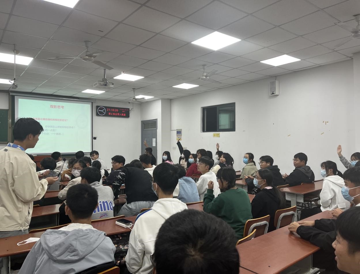 分享环节,王老师介绍抑郁症在世界范围内的流行现状,同学们积极回答“男主角表现出哪些抑郁症状、从女主角身上学到如何陪伴抑郁症患者”等思考题,分享自己对于电影及抑郁的见解。最后,王老师总结了抑郁症的易感人群、原因、治疗方案,并留下心理中心24小时生命热线,嘱咐同学们善于自助、勇于求助。