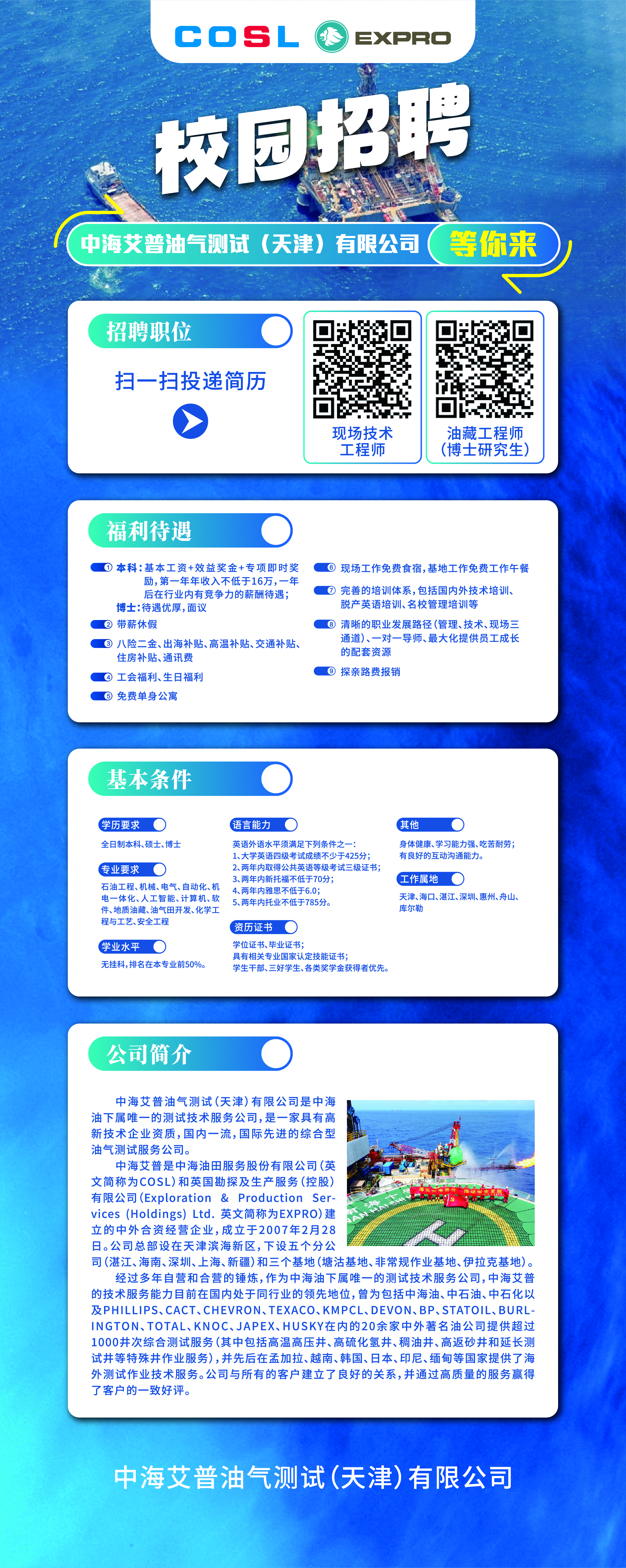 招聘职位:现场技术工程师(本科、硕士)、油藏工程师(博士)