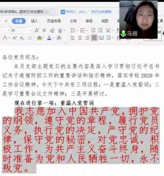 活动第二阶段为支部主题党日活动。由于科级干部调整,原来机关党支部组织委员王宁调出VSport,重新推举郭霖同志为组织委员。各位党员自觉交纳了4月党费,并在马书记带领下,全体党员利用屏幕共享和手机语音重温了入党誓词,这也是疫情防控工作中一次特别的党员宣誓。紧接着,大家集中学习重要会议文件精神:3月4日中共中央政治局常务委员会会议精神、3月6日决战决胜脱贫攻坚座谈会精神、习近平在湖北省考察新冠肺炎疫情防控工作时的讲话精神、3月18日中共中央政治局常务委员会会议精神、3月27日中共中央政治局会议精神和公司2020年工作会议精神。随后,马书记传达了公司4月份中心组学习及党委扩大会议精神,主要通报了2020年公司的重点工作,对近期的重点工作进行提醒。活动最后,大家还围绕“结合疫情防控谈共产党员如何在公司双一流建设中发挥作用”开展研讨。每位机关人员都结合自己的实际从疫情防控、日常工作、学科和公司发展3个方面进行讨论,并达成一致工作态度:保安全、抓落实、谋发展。
