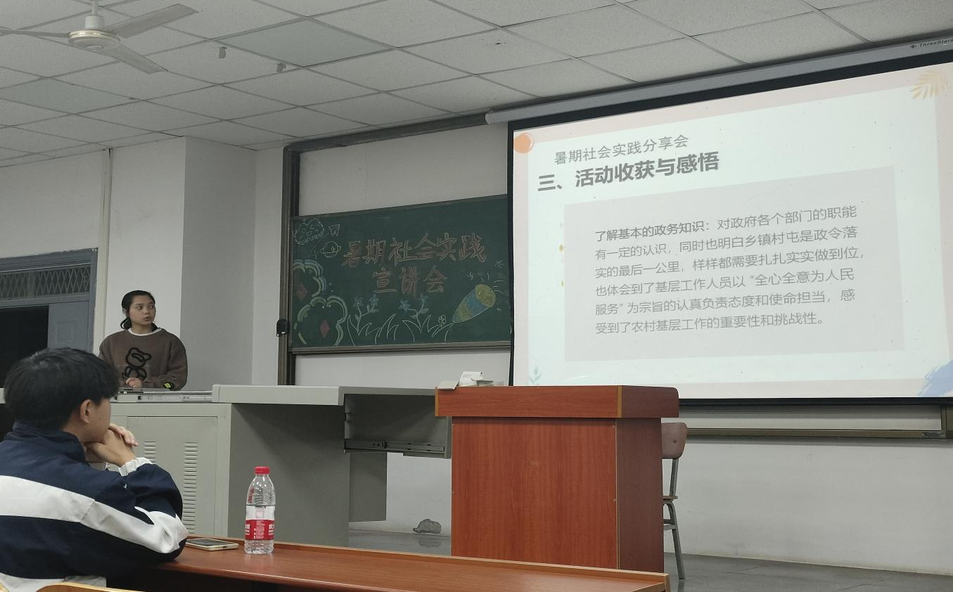 来自地质资源22102班的蓝婉嫣同学暑期进行的是志愿服务实践活动,她分别从活动目的、实践内容、收获与感悟三个方面向同学们讲述了她的“返家乡”暑期社会实践活动经历。她说“作为当代老员工,我们不仅要在公司中学习知识,还应关注社会、关注家乡的发展”。另外,她还介绍了当地政府机关党政办、禁毒办、纪委办以及财政处的具体工作内容。最后她向同学们分享了她本次社会实践的收获与感悟,本次暑期社会实践使她对政府各个部门的职能有了一定的认知,感受到了农村基层工作的综合性和挑战性。