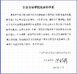 贵系多年来分配到我单位的资源勘查工程专业 ( 原石油地质与勘探专业 ) 毕业生热爱石油事业,工作能力强,团结合作精神强,表现出了良好的思想品德素质和专业素质, 特别是毕业生在沉积学方面基础论扎实,动手能力强,只有一定的综合运用所学知识解决实际问题的能力,并且掌握 — 定的学科前沿发展动态。 目前江汉油田处于发展良好时期,特别需要贵系资源勘查工程专业毕业生来我单位工作,希望在毕业生中给予宣传、推荐和支持。 ( 详细内容 )