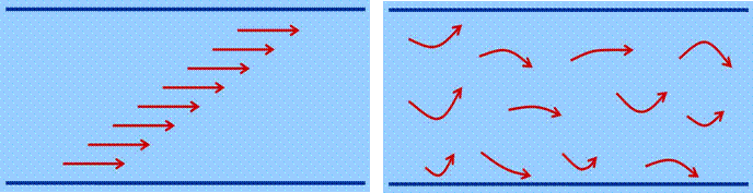 层流是一种缓慢流动的流体,流体质点作有条不紊的平行的线状运动,彼此不相掺混。紊流是一种充满了漩涡的急湍流动的流体,流体质点的运动轨迹极不规则,其流速大小和流动方向随时间而变化,彼此互相掺混。
