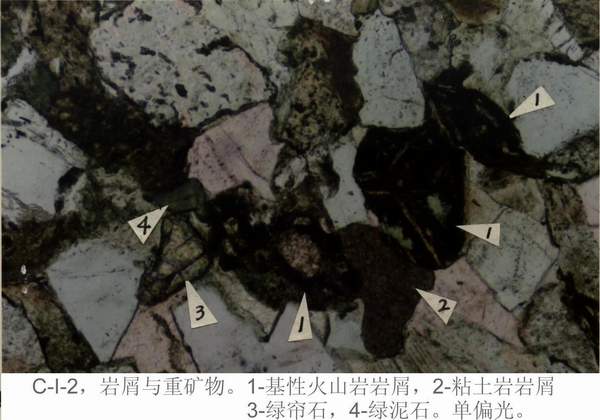 I20:颗粒:石英(多具裂纹)、石英岩岩屑、燧石、粘土岩岩屑、页岩岩屑、粉砂质页岩岩屑、绿泥石片岩岩屑。