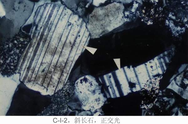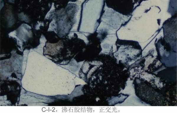 I2:①颗粒:石英、斜长石(绢云母化)、微斜长石、黑云母(绿泥石化)、白云母、绿帘石、石榴石、粘土岩岩屑、火山岩岩屑、黑色金属矿物。②杂基:无。③胶结物成分:以沸石为主,部分可见方解石。④胶结类型:孔隙式胶结。