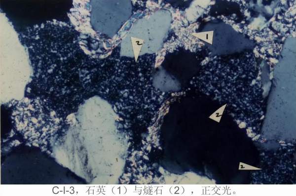 I1:①颗粒:石英(有再生加大现象)、燧石、粘土岩岩屑。②杂基成分:粘土矿物,少量细粉砂级的石英碎屑。③胶结物成分:以硅质为主,有少量铁质,硅质已重结晶为显晶质石英,使石英碎屑颗粒再生加大;铁质成为石英碎屑颗粒的周边。④胶结类型:孔隙式胶结。