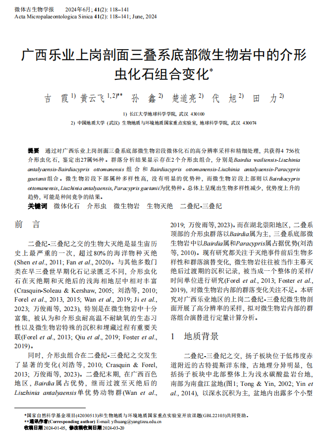 VSport黄云飞教授团队长期从事古-中生代之交重大地质转折期生物灭绝与生物复苏方面的研究,团队成员吉霞在古生物学领域核心期刊《微体古生物学报》上发表题为“广西乐业上岗剖面三叠系底部微生物岩中的介形虫化石组合变化”的研究论文。VSport为论文第一署名单位,研究生吉霞为论文第一作者,黄云飞教授为该文通讯作者,本项研究得到国家自然科学基金项目和生物地质与环境地质国家重点实验室开放课题共同资助。