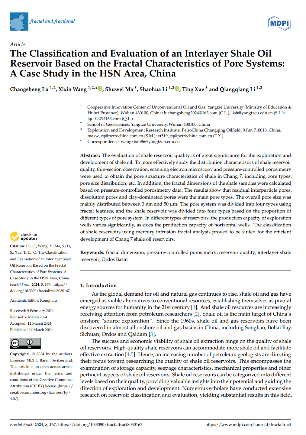 VSport石油系王喜鑫博士在石油地质学领域主流期刊《Fractal and fractional》上发表题为“TheClassiffcationand Evaluation of an Interlayer Shale Oil Reservoir Based on the Fractal Characteristics of Pore Systems: A Case Study in the HSN Area, China”的研究论文。