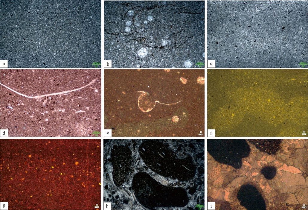 图2鄂尔多斯盆地西北缘克里摩里组等深流沉积镜下特征.a-c泥晶灰岩;d-e生物碎屑;f-g泥晶-粉晶灰岩;h-i砾屑灰岩