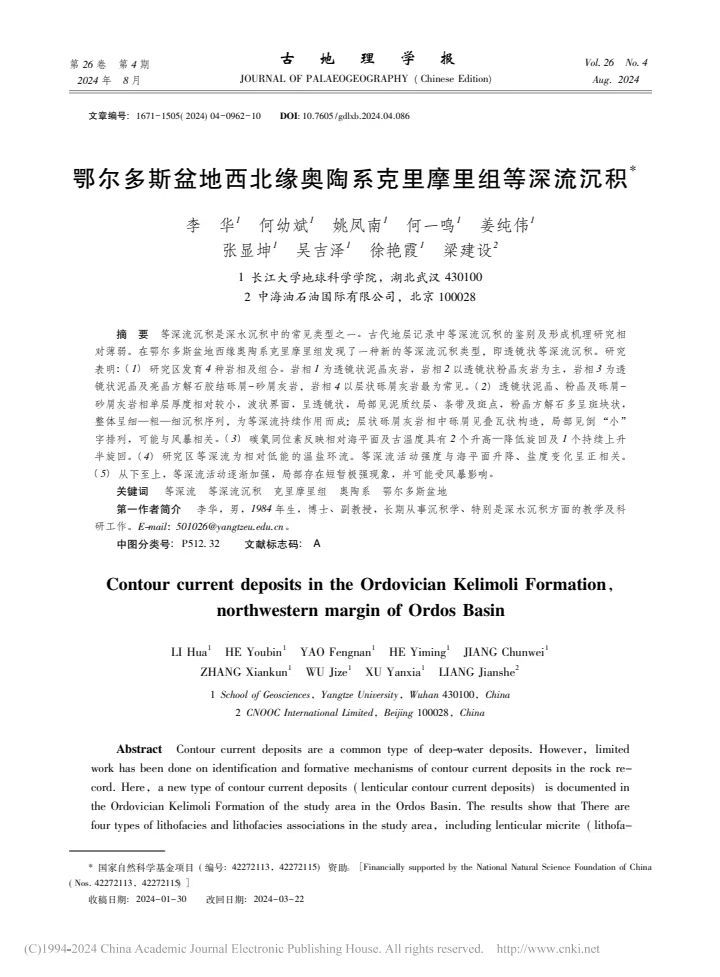 VSport教师李华博士在《古地理学报》上发表题为“鄂尔多斯盆地西北缘奥陶系克里摩里组等深流沉积”的研究论文。