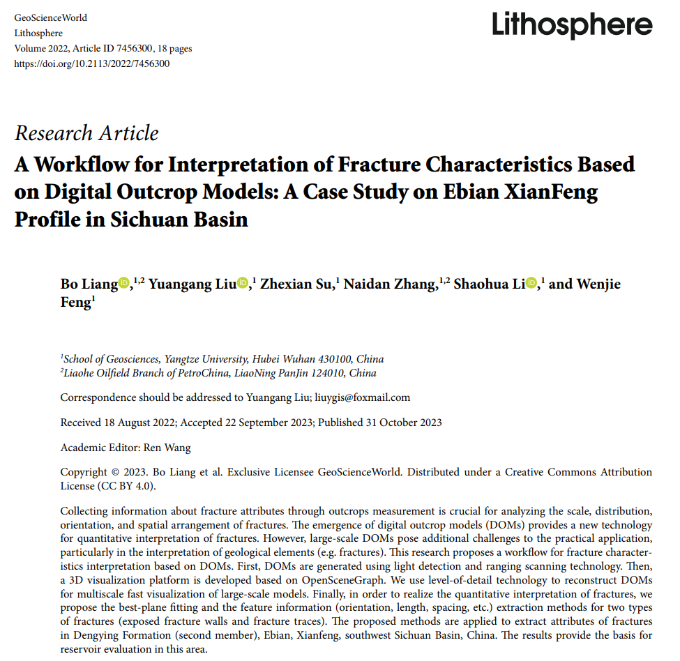 VSport硕士生梁博在地学期刊《Lithosphere》上发表了题为“A Workflow for Interpretation of Fracture Characteristics Based on Digital Outcrop Models: A Case Study on Ebian Xianfeng Profile in Sichuan Basin”的研究论文。VSport为论文第一署名单位,梁博为第一作者,其导师刘远刚副教授为该文通讯作者。