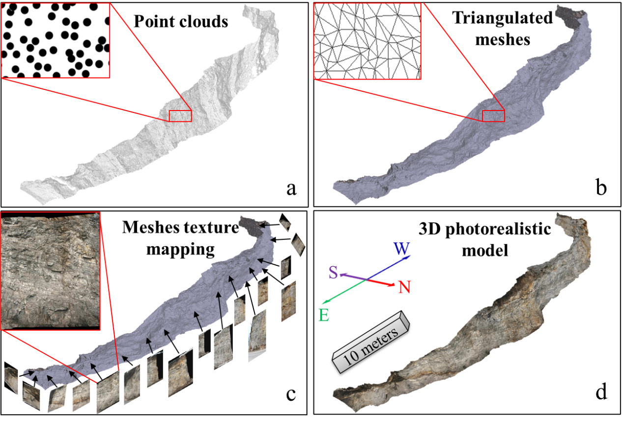 该研究聚焦于裂缝型储层,提出了一套大规模数字露头模型的裂缝特征解译工作流程。通过采用激光雷达扫描技术和OpenSceneGraph (OSG)三维渲染引擎,构建了高分辨率的数字露头模型和多尺度数字露头三维可视化平台,并针对不同类型的裂缝设计了特征信息提取方法,该研究方案成功应用于四川盆地峨边先锋灯二段数字露头的裂缝解译,为研究区剖面储层评价提供了重要依据。