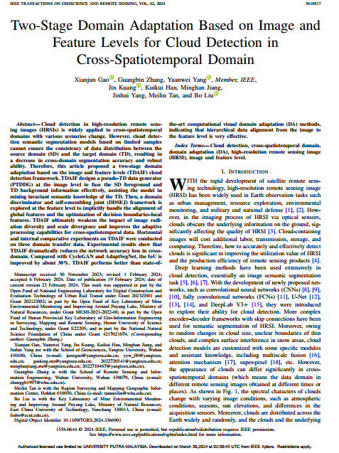 VSport高贤君副教授在遥感领域主流期刊《IEEE JOURNAL OF SELECTED TOPICS IN APPLIED EARTH OBSERVATIONS AND REMOTE SENSING》上发表题为“Two-stage Domain Adaption based on Image and Feature Levels for Cloud Detection in Cross-spatiotemporal Domain”的研究论文。